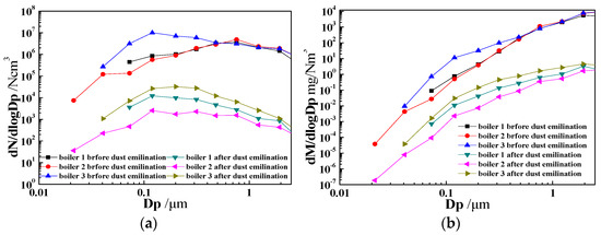 Concentration size distributions of fine particle at upstream and downstream of CFB boiler dust remover. (a) number concentration; (b) mass concentration.