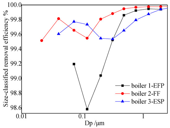 As it shown in Figure 7, after dust removal, the content of Na and K increased, because Na and K allow easy gasification and enrichment in PM0.38, and the removal efficiency of each precipitator for PM0.38 is lower than PM0.38~2.5. The removal effect of the dust remover on different elements was different. After FF, the content of Ca, S and Fe decreased significantly but the content of Si and Al increased, which means that the removal effect of FF on fine particles rich in Ca, S and Fe was better than particles rich in Si and Al. This may be due to the different removal efficiency of FF on different-sized particles, which are enriched with different elements. Since Ca can greatly increase the fly ash resistivity [24,25], ESP found it difficult to remove Ca-rich particles, and after the dust removal device, the reducing of flue gas temperature can cause sulfuric acid generation and condensation on fine particle surfaces. Therefore, after ESP (boiler 3), the content of Ca and S increased. ESP was not as effective as FF in the removal of Fe-containing particles. Because the element-removal characteristics were controlled by two types of dust removal device, the changes in the content of elements other than Ca and S in fine particles after EFP are the same as FF. The content of Ca and S increased due to the influence of the electrostatic precipitator in EFP.