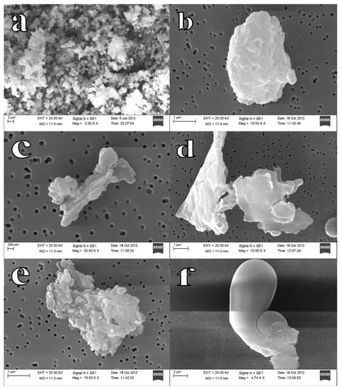 Micrographs of fine particle formed by power plant CFB boiler. (a) micrograph of a great quantity of fine particles; (b–d) main morphology of irregular fine particles; (e) particles with ultrafine particles adsorbed on the surface; (f). partially melted particles.