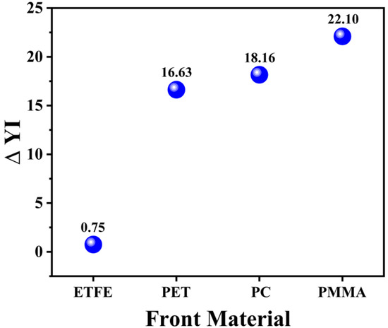 The yellowness index (YI) is an important factor that describes the change in color of a sample from white to yellow [27]. This usually occurs because of over exposure to damaging environmental conditions, such as dust, UV radiation, and temperature. The causes of yellowing of polymer materials due to alteration in their properties have already been presented in the literature [25,28,29,30,31,32,33]. In the case of ETFE, the discoloration of the films hardly changed after the UV test, as indicated by the YI values. Figure 2 shows the changes in the YI of the various front materials.