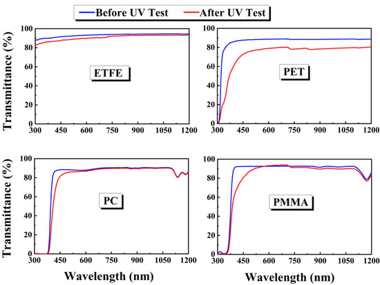 The change in the YI affected the transmittance of the material. This was confirmed by the change in the transmittance. Figure 3 depicts the transmittance analysis of the front material before and after UV testing in the wavelength spectrum of 300–1200 nm. Table 1 lists the average transmittances of the various lightweight materials before and after the UV test in the wavelength spectrum of 300–1200 nm. It is apparent that the transmittances of ETFE, PET, PC, and PMMA decreased to approximately 2.65%, 15.01%, 2.98%, and 4.16%, respectively, after the UV reliability test. The decrease in transmittance for PC (2 mm) in our work was 4.16% after 150 h of UV exposure, but Redjala, S., et al. showed a 20% drop in transmittance of PC (4.5 mm) after 72 h of UV exposure [25]. Another study showed a decrease in transmittance in PMMA of about 5% after UV exposure of 360 h [28]. The negligible decrease in transmittance of ETFE after UV exposure was already seen [26]. This shows that ETFE has superior UV characteristics as compared with other materials. Our results also showed that the ETFE showed very little effect in transmittance of ETFE after exposure to UV light.