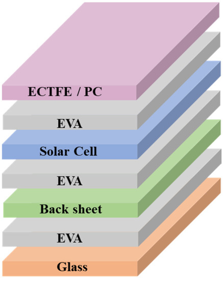 Photovoltaic (PV) energy production has gained considerable interest because it is environmentally friendly and does not contribute much to air pollution [1]. PV systems have been installed on land and in a variety of forms including building integrated PV (BIPV) systems [2], floating PV systems [3], and agro-PV systems [4]. Of these, BIPV systems are currently predominant [5]. Currently, the majority of BIPV systems in the market are based on a standard module architecture and exhibit various drawbacks including being heavy weight because of the presence of one or more layers of glass [6]. Acrylic and other polymers are employed as glass replacements in lightweight crystalline-silicon PV modules [6,7,8]. The weight of the PV module can be significantly lowered if the front sheet is made of a polymer rather than glass, because glass constitutes approximately 70% of the module’s weight [9]. In terms of the cost (for the system itself, as well as for the construction and the maintenance and transportation), polymers offer cost-effective solutions in comparison with conventional structures (based on conventional materials, e.g., glass). Lightweight PV modules are beneficial in terms of being easy set up on weak ground or in older buildings and in applications wherein the light weight of the PV module is necessary. In addition, they may be fabricated in almost any size and shape, providing the building with an effective and low-maintenance framework. Furthermore, in recent years, a number of studies have been conducted to increase the supply of lightweight PV modules and systems [10,11,12]. When a polymer material is used instead of glass as the front-surface material of the PV module, its properties differ from those of low-iron tempered glass; therefore, an assessment of the PV module’s output and reliability is required. Various lightweight materials can be used as front sheets for PV modules. Ethylene tetra fluoro-ethylene (ETFE) films offer excellent corrosion and temperature resistance as well as relatively high melting temperatures. They are light, flexible, and exhibit high transmittance [13]. They show high transparency (95% for the visible light and 85% for UV light). Additionally, polyethylene terephthalate (PET) exhibits high transparency, good mechanical properties, and good chemical resistance [14]. It has been used in a variety of applications ranging from food and drink containers to the manufacture of electronic components. Polycarbonate (PC) is a thermoplastic polymer that is lightweight, exhibits high shock resistance, and has good mechanical properties and transparency [15,16]. Research on lightweight PV modules with PC films as the front material has been conducted in recent years [17]. It is widely used in optical, electronics, medical, and spatial applications and for the preparation of nanowires and nanotubes. Its high impact resistance makes it an important component in many devices such as tablets, smart phones, and so on. Because of its transparency, it is also used in windshields, SED technology, and security screens. Polymethyl methacrylate (PMMA), also known as acrylic glass, is a transparent polymer with enhanced mechanical and scratch resistance properties [18]. The environmental stability of PMMA is superior to those of most other plastics. It can be use in several applications such as transparent panels, contact lenses, and industrial parts, as well as areas of medicine, ballistic protection, and the automobile industry. Hence, it is necessary to analyze the light transmittance and ultraviolet (UV) properties of a material along with the corresponding weight reduction of the PV module. In a joint meeting with module producers and SERI, it was indicated that bursts of sunlight can penetrate the atmosphere at wavelengths of 220 nm [19]. Therefore, even materials with a high initial light transmittance cannot be utilized as the front sheet of the PV module if the transmittance is considerably lowered after the UV test.