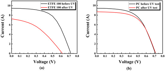 I–V curve of the lightweight one-cell PV module using (a) ETFE and (b) PC as a front cover sheet before and after the UV test.
