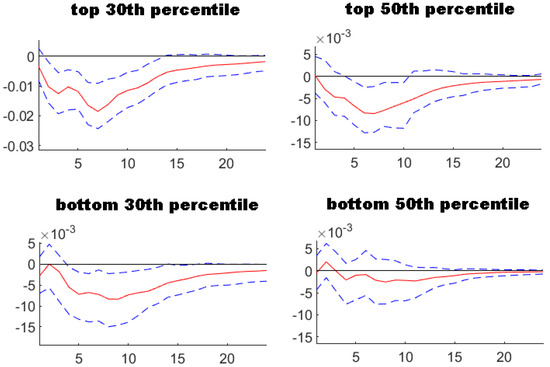 As we can see, the models with interaction terms gave different results than the baseline specification. Energy import dependency has the biggest impact on the relationship between oil price volatility and employment structure in periods with energy imports dependency above the 30th percentile. It means that for periods with energy import dependency above its top 30th percentile, the effect of job structure fluctuation is the biggest—for these periods, oil price shocks cause job reallocation from manufacturing to services. The average value of the index of employment for the CEE countries in the period investigated equals 0.34, and the impulse response function for periods of the top 30th percentile of energy import dependency shows a fall by 0.02. It means that in response to oil volatility shocks, employment in manufacturing drops on average by 5.9% more than employment in services (the index falls from 0.34 to 0.32). Generally, for the remaining specifications, the impulses follow a similar direction (relative decline in employment in the manufacturing sector), but the impact of external oil shocks on the structure of employment is much smaller. These results suggest that the relationship between energy import dependency and the employment reallocation effects of oil shocks is not linear—employment fluctuations are the biggest when energy import dependency is exceptionally high, but for other periods the level of energy imports seems to be of minor importance for job reallocation. The observed regularities favor our threshold approach in capturing the role of energy import dependency. Interestingly, interaction terms in IPVAR models do not have to be dummy variables. If we assume that the relationship between endogenous variables and interaction terms is linear, we can employ real values of the interaction term (see [21]).