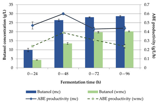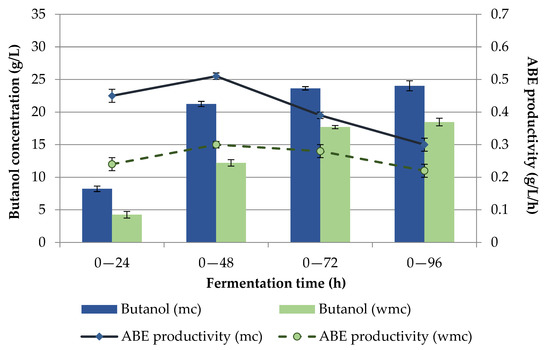 Based on the results in Figure 1, a higher concentration of butanol was found in each day of the process: about 3.9 g/L over the period of 0–24 h, 9.0 g/L over 0–48 h, 5.9 g/L over 0–72, and 5.6 g/L over 0–96 h compared to those achieved with the control without mineral compounds supplementation.