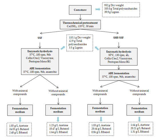 A simultaneous saccharification and fermentation (SSF) process and consolidation SHF/SSF process was conducted after the corn straw was pretreated. During this processes the monosaccharides available in the medium (C6 and C5 sugars) are converted to a mixture of solvents (ABE). The SSF method (simultaneous saccharification and fermentation) assumes the combining of hydrolysis and acetone-butanol-ethanol (ABE) fermentation into a single operation, which is performed in a single reactor, at 37 °C, for 96 h, without pH control. To increase the initial monosaccharides concentration in the SHF/SSF method, the SSF process was modified. In the first stage, which was characteristic for the separate hydrolysis and fermentation (SHF) method, the lignocellulosic substrate was subjected to enzymatic hydrolysis at the optimum temperature for enzymes (50 °C) for 4 h. The substrate was then cooled to 37 °C and inoculated with C. acetobutylicum DSM 1731. The method became SSF, since the saccharification (due to the presence of cellulose enzymes in the substrate) and the fermentation (due to C. acetobutylicum inoculation) were functioning simultaneously. The initial pH of the medium for both strategies was pH 5.0. The pH was controlled by using 3 M NaOH and 0.5 M H2SO4.