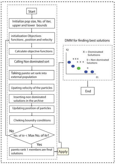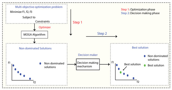 - Termination test: The Pareto set solution is determined in Phase 1, and the optimal solution is picked in Phase 2. The DMM is applied to pick the optimal solution. The MOGA flowchart is shown in Figure 1. The computational time and number of iterations of the MOGA for the proposed case studies are shown in Table 1. The proposed technique for the scheduling problem was implemented using MATLAB 2021a.