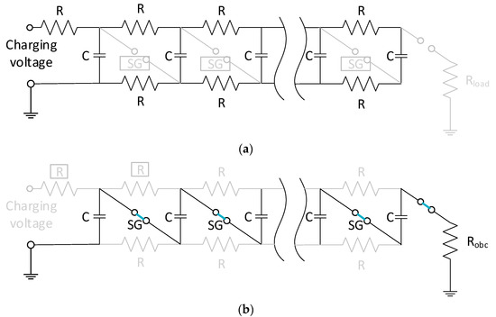 Figure 1b). Otherwise, the efficiency of the generator will drop significantly or the device will not work at all. On the other hand, the high resistance of these resistors increases the time constant of the system during charging, which does not allow all the capacitors to be recharged in a sufficiently short time. Therefore, in such applications instead of resistors, inductors [