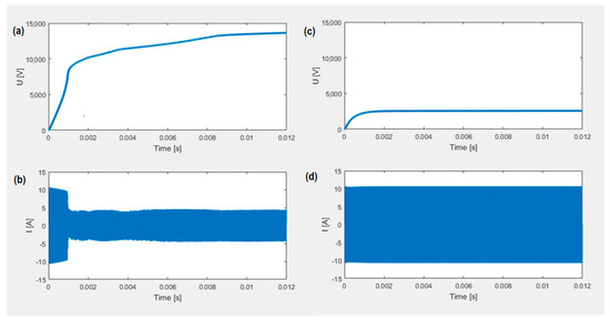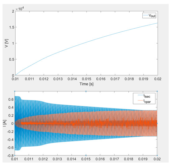 Figure 5b) is approaching the voltage resulting from the transformer ratio and its supply voltage (15 kV). On the other hand, using a transformer model that reflects the real element much more closely, taking into account even a small parasitic capacitance of 10 pF, the current in the primary winding is much higher throughout the whole simulation period (