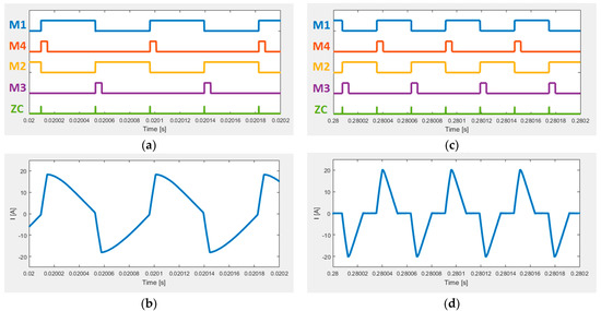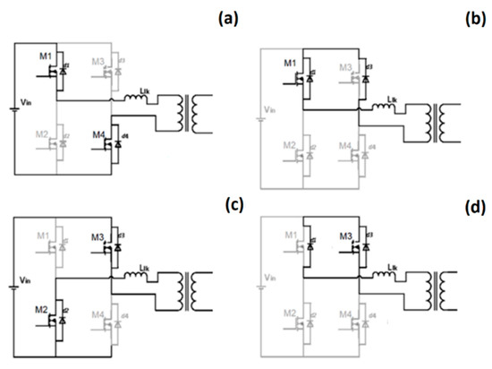 Figure 9a,c). Then, in freewheeling state (in contrast to phase-shifted method), the low side transistor is turned off and only the one high side transistor is still on to ensure a continuous flow of current through the primary winding (