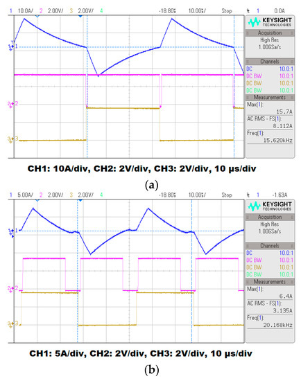 Figure 9a,c) and the minimum freewheeling state time (in non-quasi-resonant mode) was set to 20 μs (