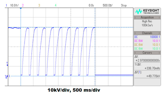 Figure 17 shows the Marx generator recharging process after generating a sequence of pulses. It can be seen that the recharge time is always lower than 330 ms, and after the discharge, the next charging cycle starts automatically.