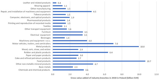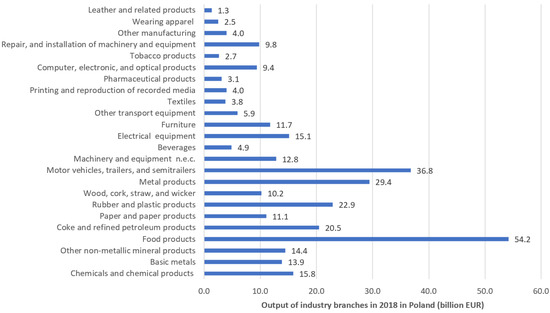 The biggest sectors of Polish industry are manufacturing of food products (16.9%), automotive (11.5%), metal (9.2%), rubber and plastic (7.2%), and coke and refined petroleum (6.4%), which totally are responsible for more than half of the national manufacturing output [38]. Output and gross value added of manufacturing sectors are presented in Figure 1 and Figure 2 (Euro exchange rate: EUR 1 EUR = PLN 4.30).