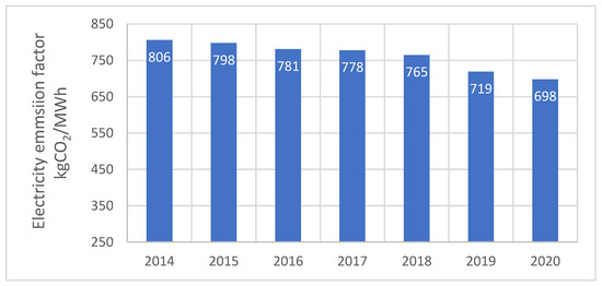 Eventually, the National Centre for Emissions Management (KOBiZE—Krajowy Ośrodek Bilansowania i Zarządzania Emisjami) reported, in 2021, CO2 emission factors per 1 MWh of electricity produced in fuel combustion sources, including electricity supplied to the grid from renewable energy sources, and taking into account losses and balance differences, i.e., at the end user [42], with a value of 698 kg CO2/MWh, which gives a successive decline for ca. 13% from 2014 to 2020 (see Figure 3).