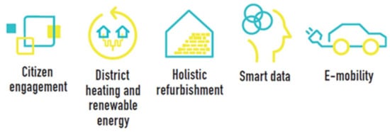 In this context, the H2020 Smarter Together project has been accomplished within the three LHCs of Lyon, Munich and Vienna, following a P2P learning process implemented at selected districts that operated as urban living labs. Over the period 2016–2021, Smarter Together has implemented five clusters of co-created, replicable, and integrated smart solutions for better life in urban districts (Figure 1). The demonstrated solutions followed a co-creation process that involved key stakeholders of the three LHCs and covered (1) holistic refurbishment for low-energy districts of public and private housing, (2) local renewable energies and district heating for low-energy districts, (3) e-mobility solutions for sustainable mobility, (4) smart data-management platforms and smart services for integrated infrastructures, and (5) living labs for citizen engagement and stakeholder involvement in the established co-creation process within the LHCs, as presented in [,]. Monitoring these solutions and evaluating their impacts provides qualitative and quantitative knowledge, experience and lessons learned to help optimize the process of the implementation and deployment of integrated smart solutions, thus contributing to advanced sustainable urban transformation at district scale for both LHCs and follower cities (FCs) [,,,].