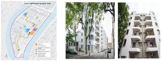 The considered integrated solutions of the LHC of Lyon have been implemented in the Confluence district located at the southern end of the city center of Lyon (Figure 3). The urban redevelopment project, Confluence Redevelopment, began in 2003 and is now one of the largest urban revitalizations in France. By the end of the 1990s, the Confluence district featured a mixture of working-class residential, industrial and commercial neighborhoods with a vast logistical platform dedicated to industrial and commercial activity. The urban redevelopment project is one of the largest in France and was started around 2000. It aimed to redevelop the Confluence and to enlarge the city center of Lyon with the creation of a durable and smart district. It consists of 150 ha land with 600,000 m2 of existing floor area and 1,000,000 m2 of new buildings. The project is also the first WWF (World Wildlife Fund)-approved urban area. Lyon has refurbished around 35,000 m2 of floor area distributed to nine buildings []. Several city stakeholders contributed to the realization of the integrated solutions of the Confluence low-energy district. They were led by SPL Lyon Confluence and encompassed Lyon Metropolis (GLY), HESPUL Association and Energtech.