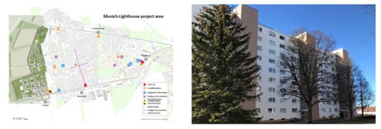 By implementing building refurbishments, building owners and tenants can potentially save heating and energy costs significantly. Homeowners qualify for free consulting from the MGS in the project district and subsidies if they agree to renovate to the “KfW Effizienzhaus 100” building standard. The aim is to increase the cost-effectiveness of the building refurbishment measures for private building owners while considering both social aspects and achieving climate protection targets. The experiences gained from Smarter Together are being applied to further holistic refurbishments in particularly for the Neuaubing–Westkreuz district (see Figure 4). More details can be found here: https://stadt.muenchen.de/infos/smartertogether.html (accessed on 11 September 2022).