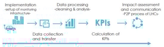 Based on a P2P learning process among the three LHCs, Smarter Together has established an integrated monitoring and evaluation methodology (IMM) within a co-creation process encompassing cities’ key stakeholders [,]. The developed concept comprises the setup of monitoring infrastructure, the automated process of meters-based data collection, the transfer to and storage in the city’s data-management platform (DMP) [], and the final step of data processing and KPI calculation.