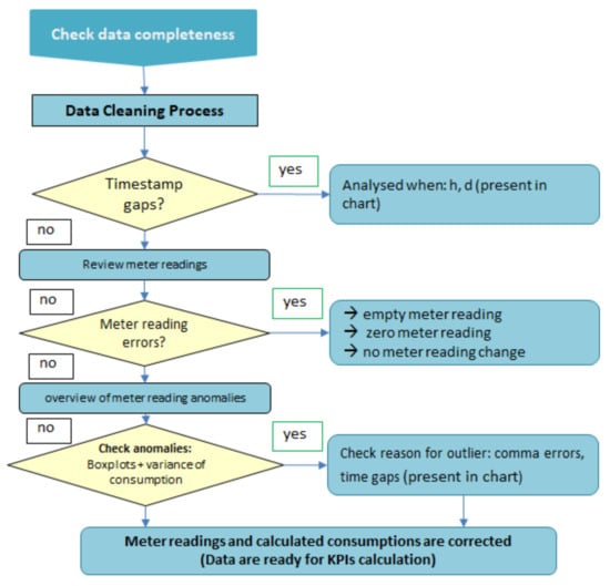 The sampling frequency of data measurement depended on the underlying process of the measured parameters and varied between 15 min and one hour for most of the energy consumption and production data. To prepare the monitoring data for the final purpose of KPI calculation, the following cleansing and processing steps were pursued, as depicted in Figure 8.