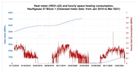 Monitoring data from the space-heating consumption meter for the accumulated meter data and the hourly heat consumption, Hauffgasse, Vienna.