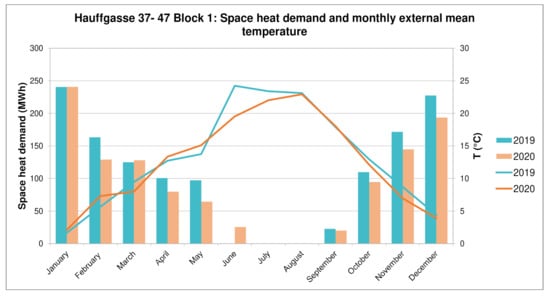 Monthly space-heat demand for 2019 and 2020, Hauffgasse, Vienna.