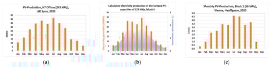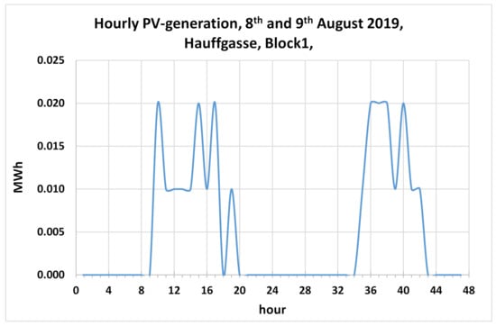 Figure 9 shows the collected heat meter data for the period (January 2019–March 2021) for Block 1 of the building complex at Hauffgasse on the Vienna demonstration site. The drop in the accumulated and cleaned meter data (left axis) in May 2020 is due to the meter exchange occurring frequently. The resulting hourly consumptions (right axis) are calculated by building the difference of the two following time steps. The curve clearly shows the expected consumption during the heating period (October–May). Figure 10 shows the results of the monthly space-heat demand supported by the real measurement of external temperature at the demonstration site for the two years of 2019 and 2020. The plotted external temperatures support the plausibility of the monitored heat demand data, as can be concluded form the course of the monthly temperature profile. Finally, Figure 11 shows the PV production on two consecutive days in August 2019 at Hauffgasse, Vienna.
