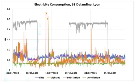 Monitoring data of electricity consumption of elevators, lighting, substations and ventilation, 61 Delandine, Lyon.
