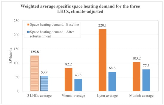 The achieved impact of the suggested building refurbishment is calculated by comparing the monitoring data of the final energy demand after the refurbishment with the baseline data—historical data collected before the refurbishment. Energy saving by building-efficiency measures results mainly from the reduction of space-heating demand (SH) (due to technical measures from improving building insulation) as well as reducing heat demand for hot water (HW). This effect is enhanced when building retrofitting also considers the rehabilitation of heat supply systems, reducing the loss of heat provision (including switching to more efficient heating systems such as district heating, heat distribution, storage, and heat dissipation, as well as any auxiliary energy for operating the heating system (including circulation pumps and system controls). In some demonstration sites in Lyon and Munich, the heating systems were switched from gas boilers to district heating. All residential buildings in the Vienna demonstration had district heating after refurbishment, except for the small dwellings of Lorystr. and Herbortgasse, which used gas boilers. The secondary school was connected to the district heating before refurbishment, and geothermal HP supplies the gym space-heating supply. The calculation scheme for c the following steps: