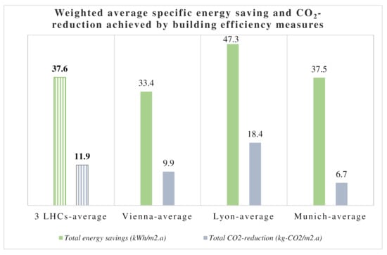 The three LHCs refurbished a total floor area of 117,497 m2 and added 12,446 m2 of new construction, mainly as new flats in attic conversions. Compared to the baseline case, the achieved annual energy saving by building energy-efficiency measures amounts to 30%, corresponding to 3967 MWh/a. The climate-adjusted annual space-heating demand after refurbishment reveals an average value of 54 kWh/m2.a, corresponding to an average improvement of about 57% compared to the baseline (all values are calculated as a weighted average over the whole refurbished floor area). Furthermore, the three LHCs have implemented a new overall capacity of around 833 kWp of PV panels, 35 kW of solar thermal and 13,122 kW of geothermal heating systems with an estimated annual generation of around 871 MWh for electricity and 274 MWh for heat. Altogether, the realized solutions for low-energy districts in the three LHCs will annually save around 4000 MWh, generate 1145 MWh of renewable energy, and reduce the annual CO2 emissions by around 1496 tCO2/a.