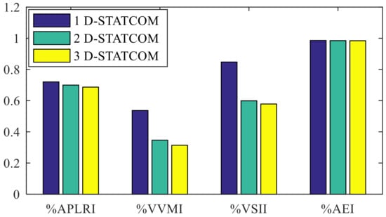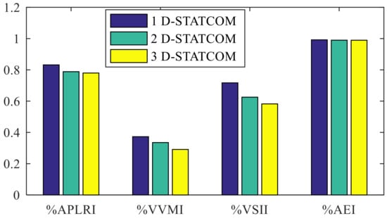 | Optimal Bus | Optimal D-STATCOM Rating, MVAr | RPL, kW | Vmin, p.u. | VSIc | %APLRI | %VVMI | %VSII | %AEI | MOF |