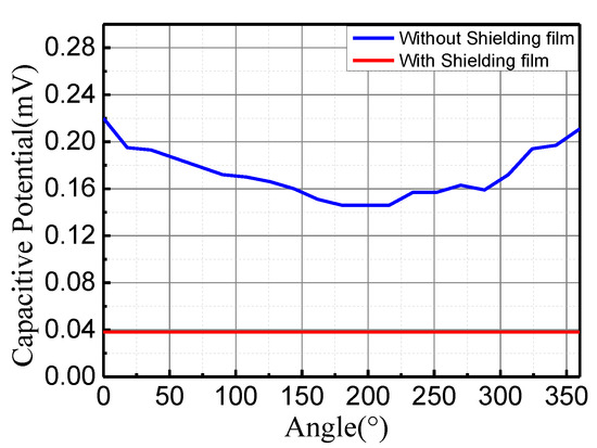 Figure 14. The capacitive potential of inductosyn with a shielding film was significantly reduced, and did not change with the relative position of stator and rotor.