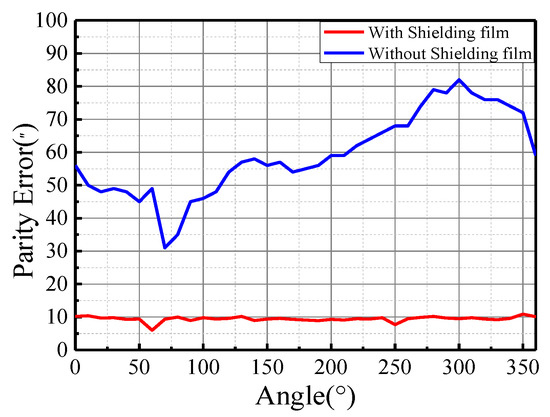 Figure 15. The zero-parity error of the inductosyn before using the shielding film was very serious, and it changed greatly with the angle. After using the shielding film, the parity error decreased from about 1′ to 10″ and remains stable.