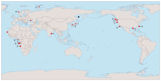 Distribution of the reported shallow subsurface and near-seafloor gas hydrate deposits at the global scale. Legends: Red stars represent fault-chimney-controlled deposits. 1—Joetsu Basin, Japan; 2—Ulleung Basin, Korea; 3—Barent Sea; 4—Mid-Norwegian margin; 5—the Lower Congo Basin; 6—Niger Delta Slope. Red squares represent the diapir-fault deposits. 1—Krishna–Godavari (KG) Offshore Basin, India; 2—Bush Hill, Northern Gulf of Mexico; 3—offshore Angola; 4—Blake Ridge Diapir; 5—the Lower Congo Basin. Red circles represent fault-controlled deposits. 1—Southern Hydrate Ridge; 2—the Bullseye cold vent; 3—Barkley Canyon; 4—Santa Monica Basin, offshore California. Black circle: Okhotsk Sea (a complex area may involve all deposit types above). Other cases: Red triangle: The Kerch seep area, Black Sea. Red diamond: The Mauritania margin.