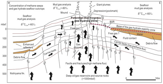 Structural and stratigraphic gas-focused model and shallow hydrate system for the Umitaka Spur. Note: Orange zones indicate debris flow deposits. Big black arrows represent the directions of gas migration. The size of these arrows represents the migration intensity (cited from [14]).