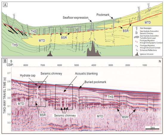 (A) Diagram illustrating gas migration and types of gas hydrates, and various related seismic signatures discovered in the Ulleung Basin. Note: Gas migrates into the GHSZ via two pathways: (1) Structural conduits, such as gas chimneys faults and fractures (blue arrows), and (2) stratigraphic conduits, such as inclined, permeable THS (red arrows) (cited from [22]). (B) An example seismic profile displaying seismic indicators including BSRs, acoustic blanking, and gas chimneys (modified from [22]). Note: MTD: Mass transport deposits; THS: Turbidite–hemipelagic sediment.