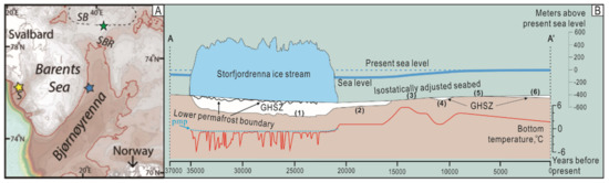 (A) Places where mounds and/or craters have been observed in the Barents Sea. Note: Blue star: Bjørnøyrenna; yellow star: Storfjordrenna; green star: Storbanken (modified from [42]). (B) Over the past 37,000 y, GHP sites have witnessed changes in the thickness of ice and GHSZ, bottom temperature, sea level, and isostatically adjusted seabed. Thereunto, (1) a subglacial GHSZ with 200 m thickness lasted 13,500 y at GHP sites. (2) After final deglaciation, an inherited glacioisostatic depression allowed a 100 m thick GHSZ to persist at GHP sites until 15,000 y ago. (3) Inflowing warm Atlantic water at 4–5 °C related to Heinrich event 1 and destabilized remnants of the GHSZ. Large-scale hydrate-bound gas is released through gas chimneys toward the seafloor to initiate the growth of the GHPs. (4) The Younger Dryas cold event induced extensive GHSZ regrowth. (5) Rapid recession of the GHSZ occurred, linked with a warm bottom water period at the Holocene Optimum. (6) Since 6500 y ago, modern oceanographic conditions have favored moderate hydrate growth at GHP sites (summarized from [40], and references therein).