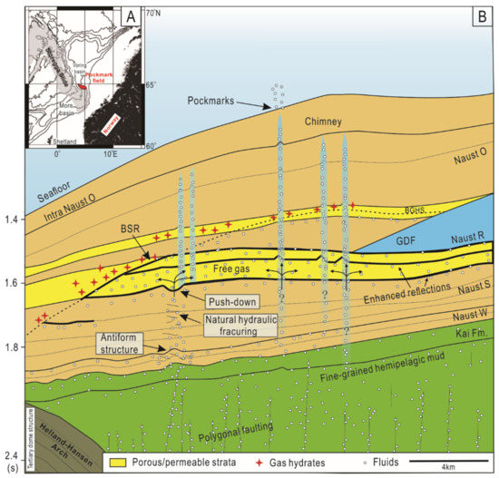 Hundreds of pockmarks containing GHPs are common in the Nyegga area on the southern border of the Vøring Plateau, 1–2 km from the Storegga Slide’s northern flank (Figure 9A). They have a strong correlation with the distribution of chimney structures. The deeper Tertiary Helland–Hansen Arch, polygonal fault system in the Miocene Kai formation, and the Plio-Pleistocene seaward prograding sedimentary wedge in the Naust formation comprising glacigenic debris flow (GDF) sediments and contourite deposits are major structural features related to the vertical fluid flow regime (Figure 9B; [48,49,50,51]).