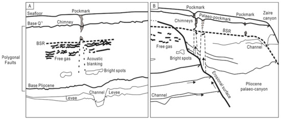 (A) A profile displays that over a turbiditic channel in the Miocene, a pockmark, an underlying chimney, and the BSRs appear to be spatially related. Deeper-sourced thermogenic gas migrates from one turbiditic channel to another to accumulate in the upper Miocene channels. The base of polygonal faults connects the syn-depositional faults within the upper Miocene interval to channel gas through the impermeable Piocene–present cover leading to chimney formation. (B) Gas chimney originates from an erosional surface corresponding to a paleoflank of the Zaire Canyon. Gas from Miocene turbiditic channels is laterally transported to accumulate below the erosional surface that can channel gas to the chimney. (A and B are modified from [66]).