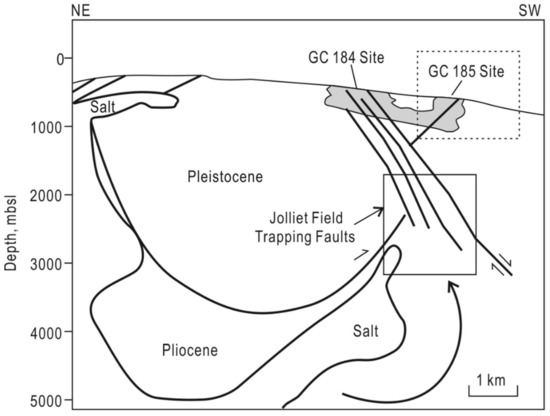 During Mid-Jurassic marine transgression, the GoM salt basin, which opened during Late Triassic rifting, was floored by a thick salt sheet [80]. Finally, during the Tertiary, massive amounts of continental detritus poured into the northern GoM, forming a thick (16 km) continental shelf [81]. Differential loading mobilizes a massive salt layer, resulting in a slew of salt-cored diapirs and accommodating faults surrounded by deep salt withdrawal minibasins [82,83]. The central GoM is home to a prolific deepwater petroleum reservoir formed by Mesozoic source rocks [77]. At the BH region, the GC184 site contains normal faults that form the trap at Jolliet Field, where oil and gas are produced from Pleistocene turbidity sand reservoirs buried at depths of 1.7–3.1 km (Figure 14; [77,84]). The GC185 site is a hydrate-bearing seafloor mound that has been charged by the focused migration of thermogenic gas along an antithetical fault to normal faults (Figure 14; [77]). The isotopic properties of C1–C5 gases from reservoirs, vents, and near-seafloor hydrates are highly correlated [77].