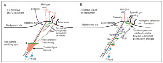 Proposed conceptual model of the formation of hydrate outcrops on the seafloor at Bush Hill (Site GC185) according to a 15-month deployment test. (A) First 130 days. A hydrate-confining layer traps large amounts of gas migrating along the antithetic fault (described in Figure 14), creating an overpressured gas reservoir capable of driving fractures that channel the gas toward the seafloor. (B) From 130 days to the end. The focused gas release disrupted the hydrate-confining layer. Variable gas venting is caused by changes in sediment permeability determined by shallow hydrate and authigenic carbonate precipitation over time (cited from [79]).