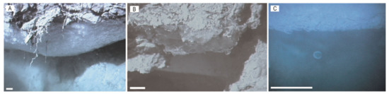 During Alvin dives in 2011, massive hydrate outcrops were discovered beneath sediment-covered contorted carbonate overhangs on the seafloor at Site 996 (Figure 18; [105]). Layers of hydrate-enveloped bubbles form the outcrops (Figure 18B). Bubbles rise from a venting site to collide with other bubbles trapped by overlying carbonate ledges (Figure 18C). Ambient hydrologic conditions (3.14 °C, 21.6 MPa) are favorable for the formation of methane hydrate near the seafloor [105]. However, CH4 content (4 μM) in plumes is much lower than even the 79 mM required to saturate the bottom water and form hydrates [100,106]. Thus, carbonate overhangs are thought to isolate pockets of seawater from external circulation, resulting in localized pools saturated in CH4, which protects the “bare” hydrate chunks from corrosion by ambient seawater [105].