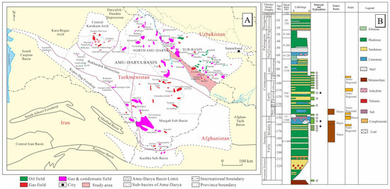 (A) Map of the Amu Darya Basin and adjacent areas, the study area is indicated by red shade; (B) Stratigraphic column and major petroleum system of the basin.