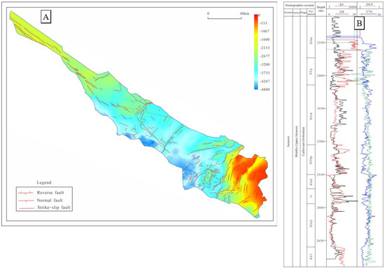 (A) Structure map (carbonate top) of the study area. (B) Target intervals and the log characteristics of Callovian–Oxfordian.