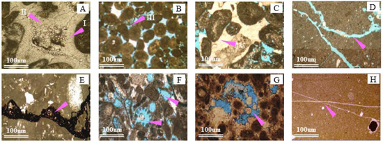 Cementation mainly occurs in a high-energy reef and shoal facies limestone where various primary pores form, and the cement is predominantly calcite. Based on the distribution patterns of cement, four-stage cementation can be identified in the Callovian-Oxfordian Stage [5,7]. Stage I: Quasi-syngenetic comb-shell-shaped calcite (0.05–0.15 mm) covered particles with a uniform thickness (of 0.05–0.15 mm) or growing along the pore wall of a biological reef skeleton pore (Figure 4A). Stage II: In the early stage of diagenesis, the equigranular (0.05–0.1 mm) sparry calcite filled in the pores between reef skeletons or bioclastic grains, growing along the pore edges, or forming a second-generation cement texture with the asaphopsoides isopachous calcite cement in Stage I (Figure 4A); Stage III: Medium-coarse grained (0.3–2.0 mm) equigranular sparry calcite filled in primary pores from late early diagenetic stage to early mid-diagenetic stage (Figure 4B). Stage IV: Intergrowth calcite filled in the remaining pores in the late mid-diagenetic stage (Figure 4C). Although the cementation process in the four stages significantly reduced the primary porosity and deteriorated the reservoir quality, the high-energy reef and shoal facies medium-thick calcite cementation process provided a rigid framework, thus reducing the impact of compaction on the quality of such reservoirs.