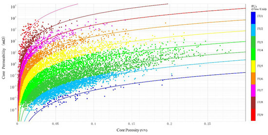 The flow units of the Callovian-Oxfordian formation were identified using the data from 68 key wells. Figure 5 is the porosity−permeability crossplot of the identified nine flow units (FUs) and the RQI of different flow units as a function of PMR are shown in Figure 6. As shown in Figure 5 and the statistical parameters of different flow units (Table 2), the average porosity gradually decreases with the increase in the number of identified FUs; the average permeability gradually increases as the number of identified FUs increases, and the FZI gradually increases. Consequently, as the number of identified FUs increases, the storage capacity of the interval gradually decreases, whereas the flow capacity and reservoir quality improve. Furthermore, by classifying FUs in key wells, the longitudinal distribution of different reservoir qualities can be better evaluated.