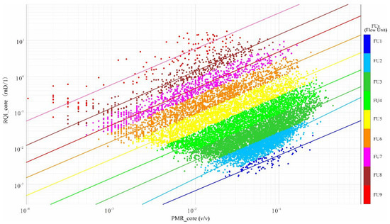 Ideally, on a log-log crossplot of reservoir quality index (RQI) versus normalized porosity (PMR), sample points with similar FZI values should be plotted on the same straight line with a slope of 1, while sample points with different FZI values should be plotted on another parallel straight line. Samples on the same straight line constitute an independent flow unit due to similar pore throat properties. When PMR = 1, the intercept of each straight line represents the average FZI value of a flow unit [15,24].