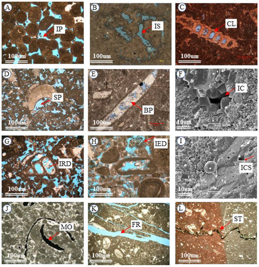 Photomicrographs and SEM images of various pore types of the Callovian-Oxfordian stage (A–L). They include interparticle (IP), intraskeletal (IS), coelomopore (CL), shadow pore (SP), bioboring pore (BP), intercrystalline (IC), intragranular dissolved pore (IRD), intergranular dissolved pore (IED), intracrystal solution pore (ICS), modic (MO), fracture (FR), and stylolite (ST) pore type.