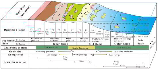 Through the analysis of sedimentary facies of Callovian-Oxfordian formation, 7 sedimentary facies belts and 15 sedimentary facies are identified; the conceptual sedimentary model is depicted in Figure 8. A relatively similar model was proposed in the Zagros area and other surrounding areas in the Middle East [33,34,35], which indicate a slightly sloping depositional setting and proposed a carbonate ramp conceptual model.