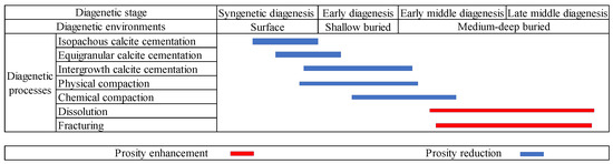- Early middle diagenesis: At this stage, intergrowth calcite cementation occurred, and chemical compaction was further strengthened, but local strong diagenetic fracturing and dissolution improved the reservoir quality. The reservoir space is still dominated by remaining primary pores, with a few secondary pores.