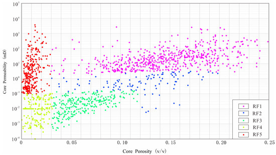 As depicted in Figure 10 and Table 3, From RF1 to RF4, the average porosity, permeability, and RQI gradually decrease, indicating that the reservoir storage capacity and flow capacity gradually decrease, and the reservoir quality gradually deteriorates. An exception occurs in the statistical values of RF5, wherein its porosity and PMR are lower than those of RF1, RF2, RF3, and RF4, indicating that RF5 has a low storage capacity (even no storage capacity at all), whereas its permeability and RQI are higher than those of RF2, RF3, and RF4. This indicates that its flow capacity is higher than those of the three reservoir facies.